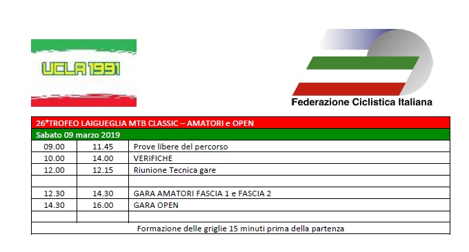 Verifica Licenze dalle ore 7.30 fino ad un’ora dalla partenza di ciascuna categoria presso Campo Sportivo di Laigueglia